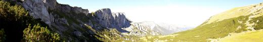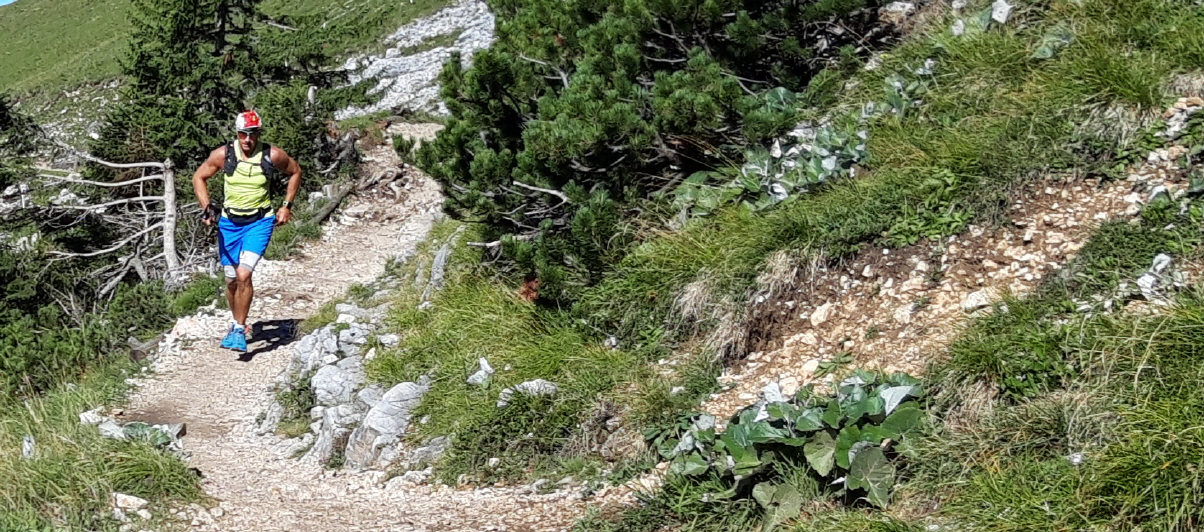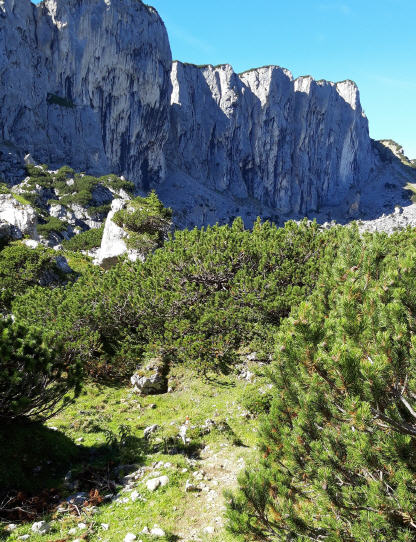 Die ersten 4km vergehen wie im Flug und bringen mich zum Steinernen Tor (1955m), einem Einschnitt im Verbindungskamm zwischen Klobenjoch und Streichkopf. Mein höchster Punkt heute. Klasse der tiefe Blick hinunter und entlang den steil abfallenden Felswänden, die mich eine Weile begleiten werden. Das Licht an diesem Vormittag ein Traum. Den vor mir liegenden Downhill bin ich schon mal Christian gelaufen, auf meiner bisher anstrengensten Tour: Hochiss und Unnützübeschreitung Mitte August 2017. Anfangs steil geht es hinunter in das Hochtal mit Almen und Latschen. Unten angekommen warten tiefe Kuhtrails mit batzigen Löchern auf mich, und prompt taucht mein rechtes Bein tief in die braune Pampe ein. Bald schlängelt sich der muntere und inzwischen trockene Trail durch Latschen und Felsbrocken in Richtung Kotalm. Flott geht es dahin, bis ich nach einem Übersteig eine Kante erreiche, an der es steiler wird.