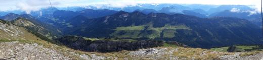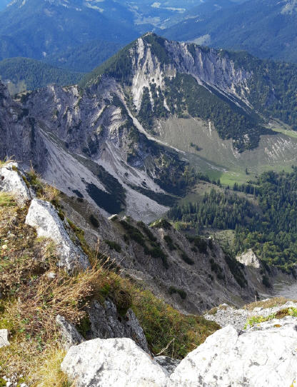 Eine erste Hütte taucht auf, ein privates Chalet, wie es über der Tür heißt. Ich ziehe meine unterste Lage aus stärke mich und schaue hoch zum H. SWJ. Zahm die Berglandschaft. Ganz anders als seine rauhe Nordseite, wie ich sie von meiner Auerspitz-Miesing-Runde aus gesehen habe. Erstmal geht es auf einem Fahrweg weiter, vorbei am Kessel des Bärenjochs, bis links der Abzweiger auftaucht. Unschwer, teils über Holzstufen, geht es hoch zum Gipfel. Der Ausblick: überwältigend. Abgesichert durch eine niedrige Felsmauer gucke ich auf die Abbrüche und hinüber zur Rotwand. Schon der Aussicht wegen hat es sich gelohnt, hierher zu kommen.