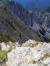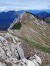 Angedacht war, auch noch auf die Krenspitze zu gehen, heute aber muss der Blick auf den Nachbarn genügen. Ich stehe allein hier oben und sehe auch sonst keinen Menschen weit und breit. Keine gute Idee, am Nachmittag noch diese Passage zu wagen. Weil es windstill ist, verbummle ich eine halbe Stunde hier oben, stärke und erhole mich. Laut Beschreibung wartet ja noch ein schwieriger Pfad zum Ende hin. Auch wenn die lange Pause meinen Impetus lahm gelegt hat, komme ich langsam wieder in Schwung und laufe zurück zur Bäckeralm. Die erreiche ich nach bisher 19km.