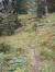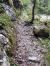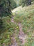Hinter der Alm beginnt ein Pfad, der zunächst leicht ansteigt und mich technisch herausfordert. Verblockt und wurzelig bleibt er auch, als es leicht bergab geht. Ab Kilometer 21 wird der Pfad schmal und ist mit Gras überwachsen. Auch wenn ich genau gucke, wo ich meine Füße aufsetze, fünf, sechsmal rutscht mein linker Fuß ab. Auch wenn das Gelände hier steil ist, gefährlich ist der Pfad nicht, der Baumbestand ist dicht. Das wiederum macht diese einsame Ecke hier wildromantisch. Nach zwei Kilometer ist auch dieses Stückchen geschafft und erreiche die Forststraße, die mich zurück nach Valepp bringt.