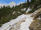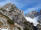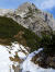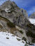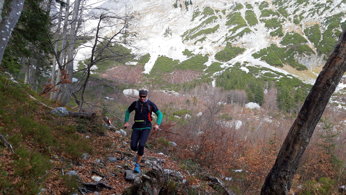 Tatsächlich aber ging es von Anfang an lustig holprig los, erst auf einem breiten Wanderweg hinein in den Wald. Dort auf trockenem Laub weiter hoch, und nach der Baumgrenze hinweg über kleinere Felsen und Schrofen; und ich fragte mich: wie zum Teufel haben Mama und Papa den nicht kraxenfähigen Einjährigen da hinauf gebracht?