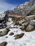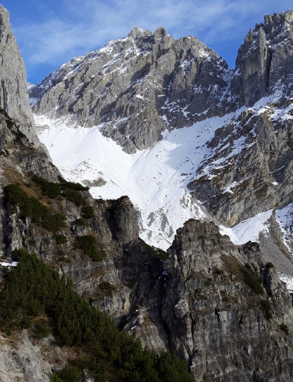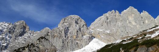 Ein paar Meter gehe ich dann noch weiter, dorthin, wo die Drahtseilversicherung beginnt, versuche der Linie zu folgen, mit dem hübschen Namen Jubiläumssteig. Denke an die Trailrunner, die beim Wettkampf um die Kaiserkrone hier laufen, auch ohne sich groß festzuhalten. Denke auch mein Mantra: Genuss statt Gehetze. Und dass Trailrunning auch ohne Klettern Sinn macht. Allerdings war ich neugierig und wollte mir das Klamml von der Nähe ansehen. Es verbindet - wie der Jubiläumssteig auch - die Gruttenhütte (1619m) mit der tiefer gelegenen Gaudeamushütte (1263m), und ist nur einen Katzensprung von ersterer entfernt. Ein paar Trittspuren im Schnee führten zwar zum Ausstieg oben, ein Risiko aber wollte ich nicht eingehen.