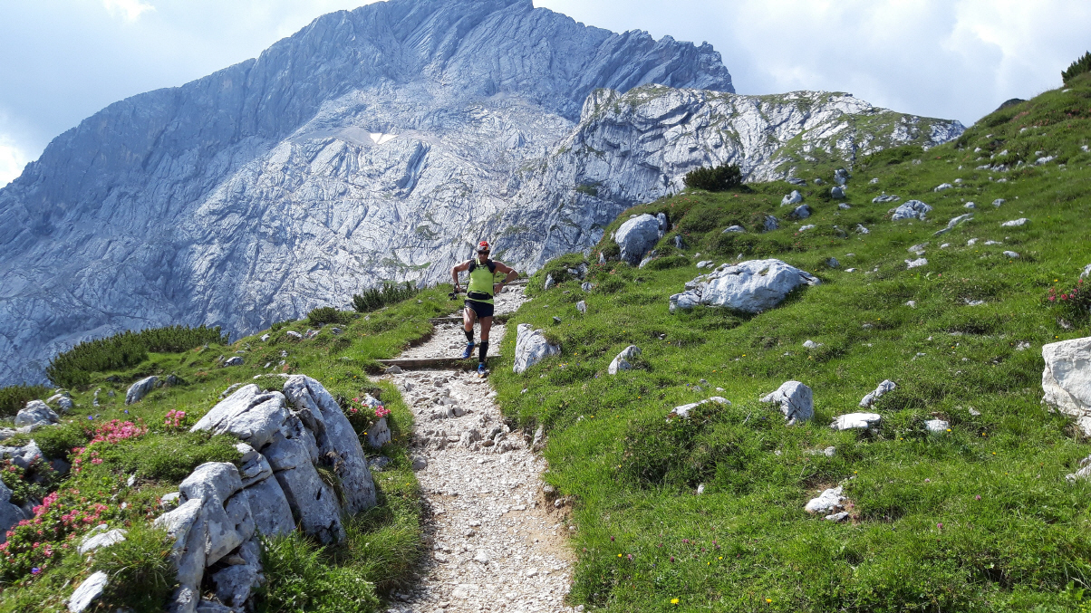 Jetzt zu meiner eigentlichen Planung. Ich wollte nahe dem Kreuzeck hinüber zum Stuibenkopf und biege ein auf den Bernadeinsteig. Noch keine 10 Uhr. Die Luft steht, es ist unerträglich heiß. Der weitere Wegverlauf wie in einem Hohlspiegel. Über die Wasserversorgung drüben weiß ich nichts. Ich breche ab. Überlege. Erinnere mich, wie ich vor vielen Jahren mit ein paar Jungs und einem Hund bei den Traildays in GAP (gibt es nicht mehr), bei Nebel und Niesel irgendwo nahe der Osterfelderköpfe einen spannenden Trail gelaufen bin, der uns hinunter zum Jägersteig gebracht hatte. Den wollte ich heute finden. Also rauf in Richtung Bergstation Alpspitzbahn.