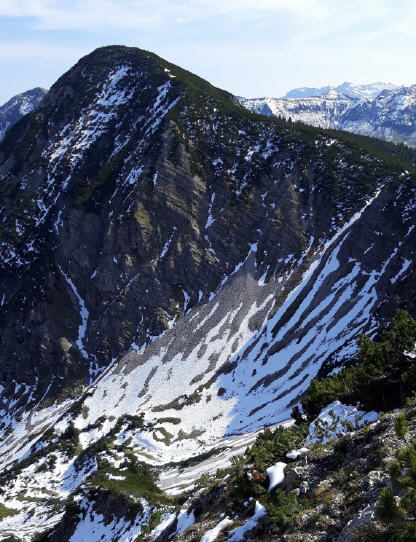 Nochmal möchte ich heute nicht übers Dürnbergjoch (1835m).Später am Gipfel erfahre ich, dass auch der Weg unten herum verschneit und nicht einfach ist. Das passt in meine Planung, denn ich will die heutige Tour als Runde über das Bächental in Tirol laufen, das juristisch seltsamerweise zur Gemeinde Eben am Achensee gehört. Apropos Eben: Eine meiner schönsten kleineren Runden ging übers Ebner Joch; sehr zu empfehlen.