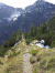 Unten quere ich hinüber und erreiche den breiten Forstweg, der mich befürchten lässt, ihn nicht mehr loszuwerden, auf acht bis neun Kilometer; ungern schlucke ich solche Kröten. Nach einer Abkürzung über eine Wiese schließe ich zu den beiden Damen auf, Mutter (B.) und Tochter (T.). Wir erreichen die Rotwandhütte. B und T gehen weiter, ich frage in die Familienrunde vor der Hütte, ob es nur diesen Forstweg oder vielleicht einen Pfad hinunter ins Walchental gibt.