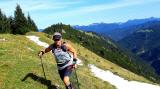 Schnurstracks geht es in Richtung Dürnbergjoch. Vorher kommt der Abzweiger zum Dürnberg, über den die Runde auch gelaufen werden kann, wenn man unten gut 7km im Flachen zum Ausgangspunkt zurückhatschen möchte. An diesem Abzweiger muss man sich auch entscheiden, ob man oben über den Grat zum Demeljoch möchte, oder etwas unterhalb nicht ausgesetzt. Ich gucke um die Ecke auf den weiteren Verlauf und entscheide mich für oben herum, da nur hin wieder etwas Schnee auf dem Trail liegt.