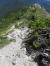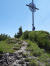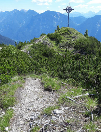 Am kreuzlosen Brünstelkopf zweigt der Pfad ab, den ich hochgekommen wäre, wenn ich anders herum gelaufen wäre. Also mein Weg hernach hinunter. Erstmal aber geht es weiter auf dem Kamm leicht bergab zum Brünstelkreuz, das erhaben auf einem felsigen Gipfelaufbau steht. Unterhalb ein Bankerl mit Blick auf Farchant und Garmisch. Rechts unten der Pflegersee. Am Bankerl erfahre ich von einem Ehepaar, dass von Farchant in 4 Stunden hier hoch gewandert ist, dass es auch hier zum Pflegersee geht, über die Reschbergwiesen, was aber ein Umweg sei.