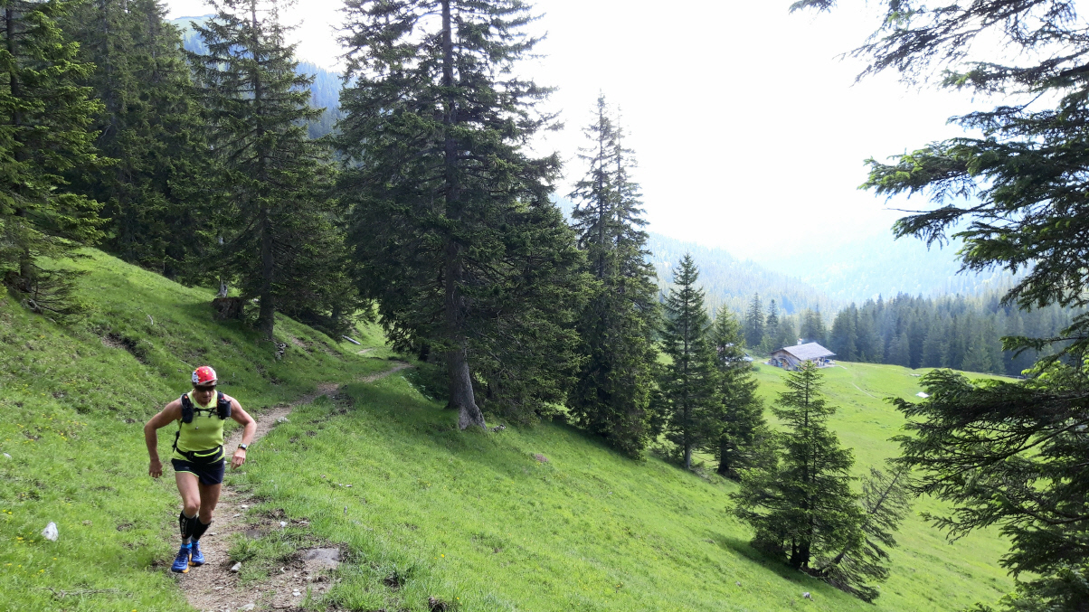 Ich erreiche die abgelegene Enningalm in den Ammergauer Alpen auf 1544m. Schnurstracks laufe ich zum fröhlich plätschernden Brunnen, kühle Kopf und Arme und fülle meine Softflask, die eine Elektrolytablette enthält. Hinter mir liegen 9km überwiegend Forstweg, sonnenexponiert.
