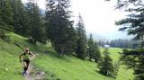 Umwege sind Kilometer, und Kilometer sind Kondition. Davon habe ich noch zu wenig, also hier runter. Erstmal klettern. Halte mich an einer Latsche fest und mache mich lang. Schrofig ist der Pfad und sandig, und der weitere Verlauf erstmal bissig. Noch ein paar schrofige Abschnitte, bevor sich ein lustiger Trail den Berg hinunter windet und mit mir im Wald verschwindet. Am Giessbachsattel ist es leider vorbei mit Lustig. Geradeaus geht es über den Schafkopf hinunter nach Farchant, ich biege rechts ein auf einen Forstweg. Hinter mir liegen 17km, und der Fortsweg zieht sich wie Kaugummi. Nach 19km erreiche die Reschbergwiesen mit beeindruckenden Solitärbäumen. Bald darauf passieren ich die Dießener Hütte. Etwas später erreiche ich den Weg, den ich heute morgen hochgelaufen bin und der mich schnurstracks zu meinem Auto bringt.