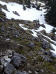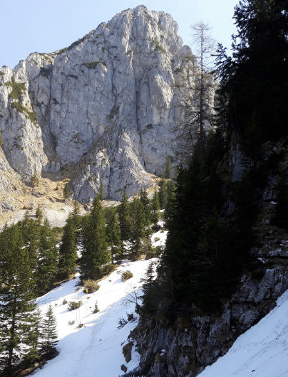Kurze Pause und wieder runter über die Scharte zum Abzweiger. Der erste Schnee. Ein Trailrunner kommt mir stapfend entgegen. Das geht noch ein ganzes Stück so weiter, meinte er, und nicht immer ist der Weg klar. Zwei mal verlaufe ich mich ein wenig, das Navigieren hilft mir nicht. Der Schnee wird tiefer im schattigen Rücken des Techno-Bergs. Immer wieder mit einem Bein bis zur Hüfte im Schnee. Langsames Vorwärtskommen unterhalb des Türkenköpfl. Komme zu weit nach rechts, das Navi aber sagt, du bist hier goldrichtig. Hm! Links drüben Stimmen. Zwei junge Pärchen juxen den Berg hinunter. Ich ihnen hinterher, auf der Direttissima. Der Blick hinüber zum Breitenstein vielversprechend, alles in der Sonne. Jepp!