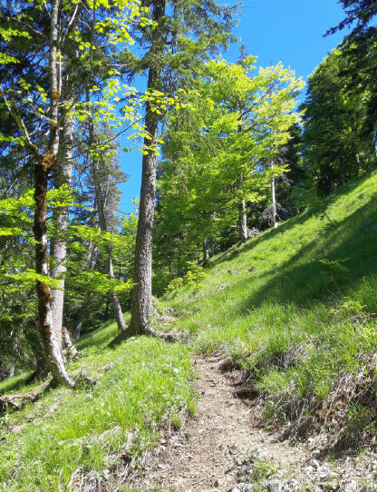 --------------------------------------------------------- Hier die Etappen meiner 19,7km langen Runde, unterfüttert mit 1260hm: Valepp – Bärenbadalm – Hinteres Sonnwendjoch (1986m) – Bärenbadalm - Reichstein-Alm - Valepp. Hier die Gegend auf fatmap.com . Und hier die Runde auf BRouter.de -------------------------------------------------------- Wildromantisch das letzte Stück, bevor es raus in die Sonne geht. Ich blicke hinüber zum Trausnitzberg, dem Österreichischen Schinder. Dominierte bis jetzt saftiges Grün, spannt sich jetzt reinstes Blau über mich. Angenehm frisch der Wind, auch die Luft noch kühl. Wird sich am Nachmittag ändern, da aber geht es bergab.
