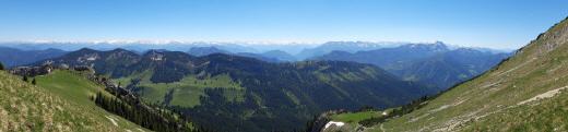 Ich erreiche die Bärenbad Almen und treffe dort auf einen Wandertrupp. Belgier. Fragen, woher ich komme. Kennen München und Munich nicht, bzw. verstehen mich nicht. Bayern München aber kennen sie. Auf einem Forstweg laufe ich weiter auf die sonnige Flanke unterhalb des Gipfels zu – es zieht sich. Zuletzt noch ein paar Stufen, und schon stehe ich nach 8km auf dem Gipfel (1986m), der nordseitig wild und rau abfällt. Grandios der Blick auf den Alpenhauptkamm. Die Nordseite des Guffert ragt dominant heraus, noch immer liegt Schnee dort.