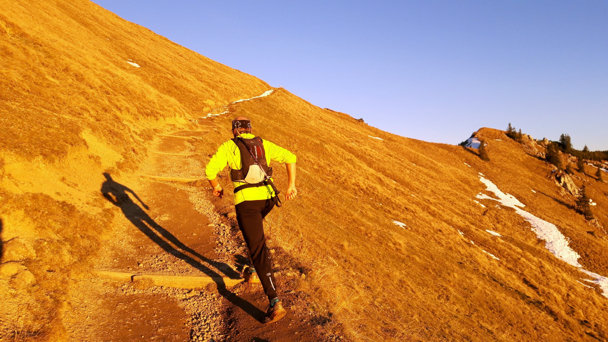 Zwanzig Minuten vor Sonnenuntergang entscheide ich, hinunter zu laufen. Es war eine gute Idee, denn ab dem Rotwandhaus laufe ich nach Westen, habe also die Farbspiele des Sonnenuntergangs direkt vor mir.