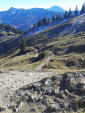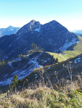 Der Bergwald spuckt mit aus und vor mir baut sich die Südseite des weithin zu sehenden markanten Doppelgipfel auf. Dazwischen die bekannte Tegernseer Hütte. Ich drehe mich um blicke auf den ebenfalls auffälligen Leonhardstein. Wenig später lande ich am Abzweiger zum Südaufstieg, gekennzeichnet als gefährlicher Weg. Brauche ich nicht.